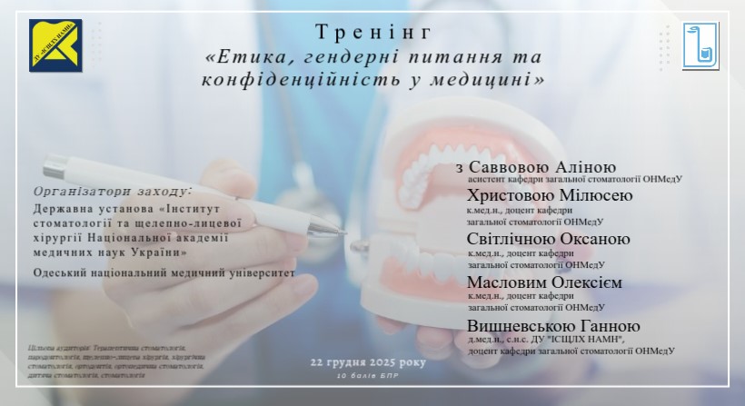 Наша мета -донесення до стоматологічної спільноти поняття конфіденційності, етики та гендерних питань в стоматології та медициці загалом. Конфеденційніть — це не просто формальність, а ключовий етичний принцип, який захищає і пацієнтів, і медичного працівника. Порушення правил роботи з персональними даними може мати серйозні правові наслідки. Саме тому тема «Етичні питання: конфіденційність» визначена як обов’язкова для проходження всіма спеціальностями не рідше ніж 1 раз за атестаційний період.